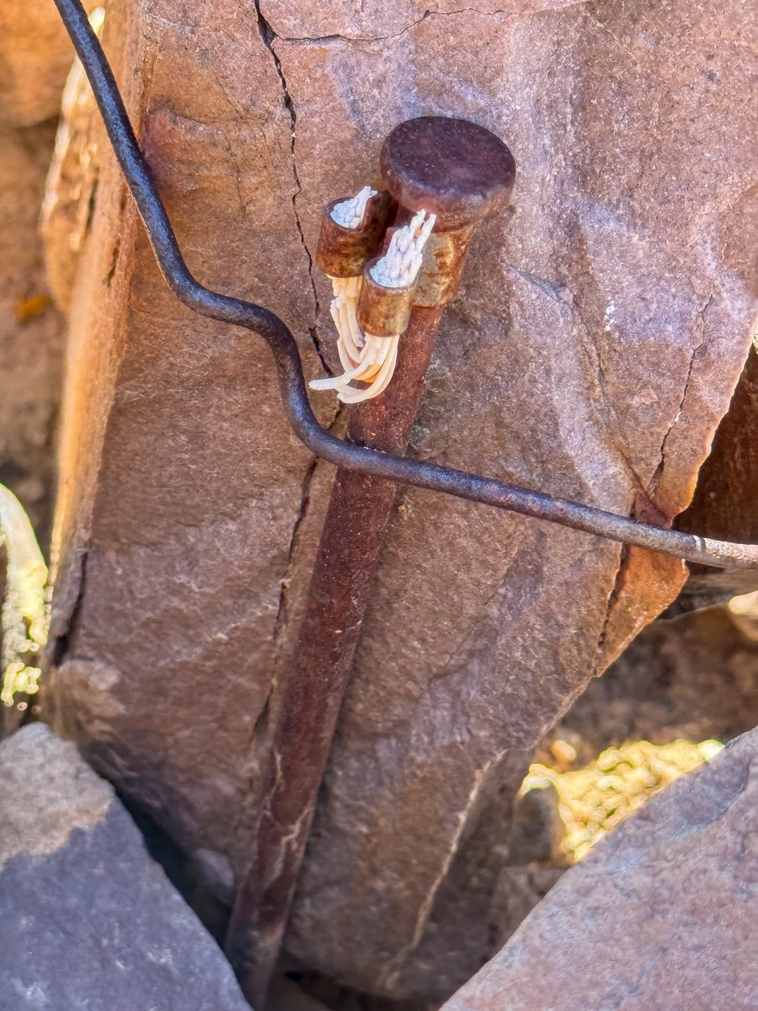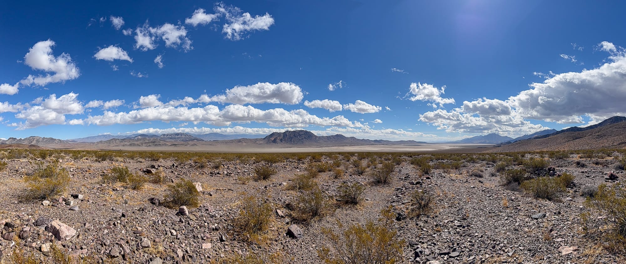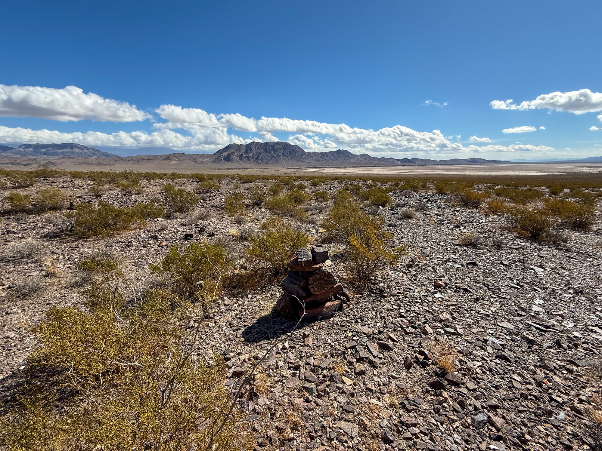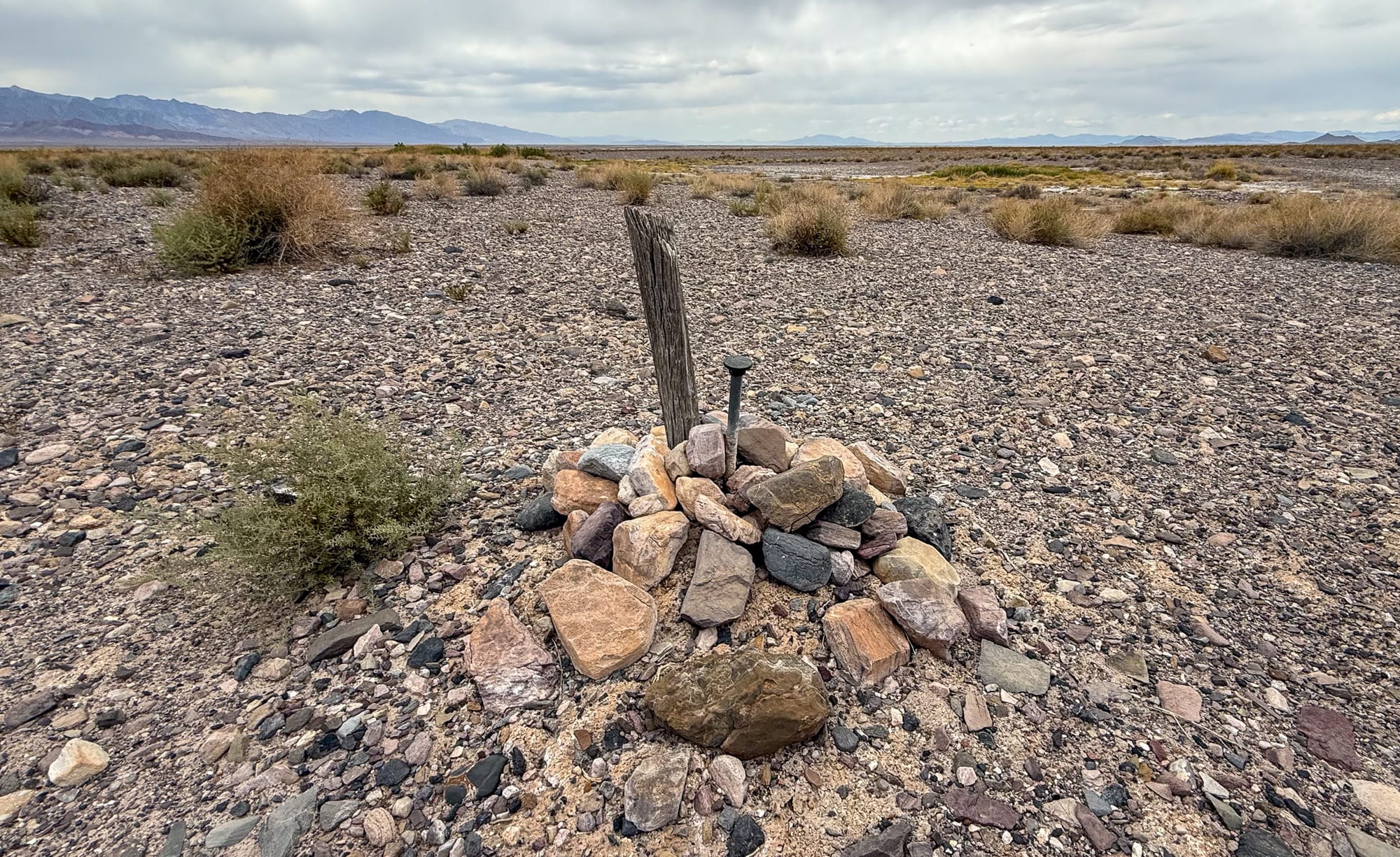 The wooden post is the original milepost 489 CA-NV boundary marker dating back 1873 and based on historical records was likely placed by Von Schmidt himself. The nail with string is from 1873 and how they attached the 66 foot long Gunter's chain that was used to painstakingly measure the boundary. The wide panoramic shot is looking into the Stewart Valley dry lakebed and is where the kink in the Von Schmidt line occurs. Finally the stone monument is a relocation when Von Schmidt attempted to go backwards form the Colorado River to correct his errors.