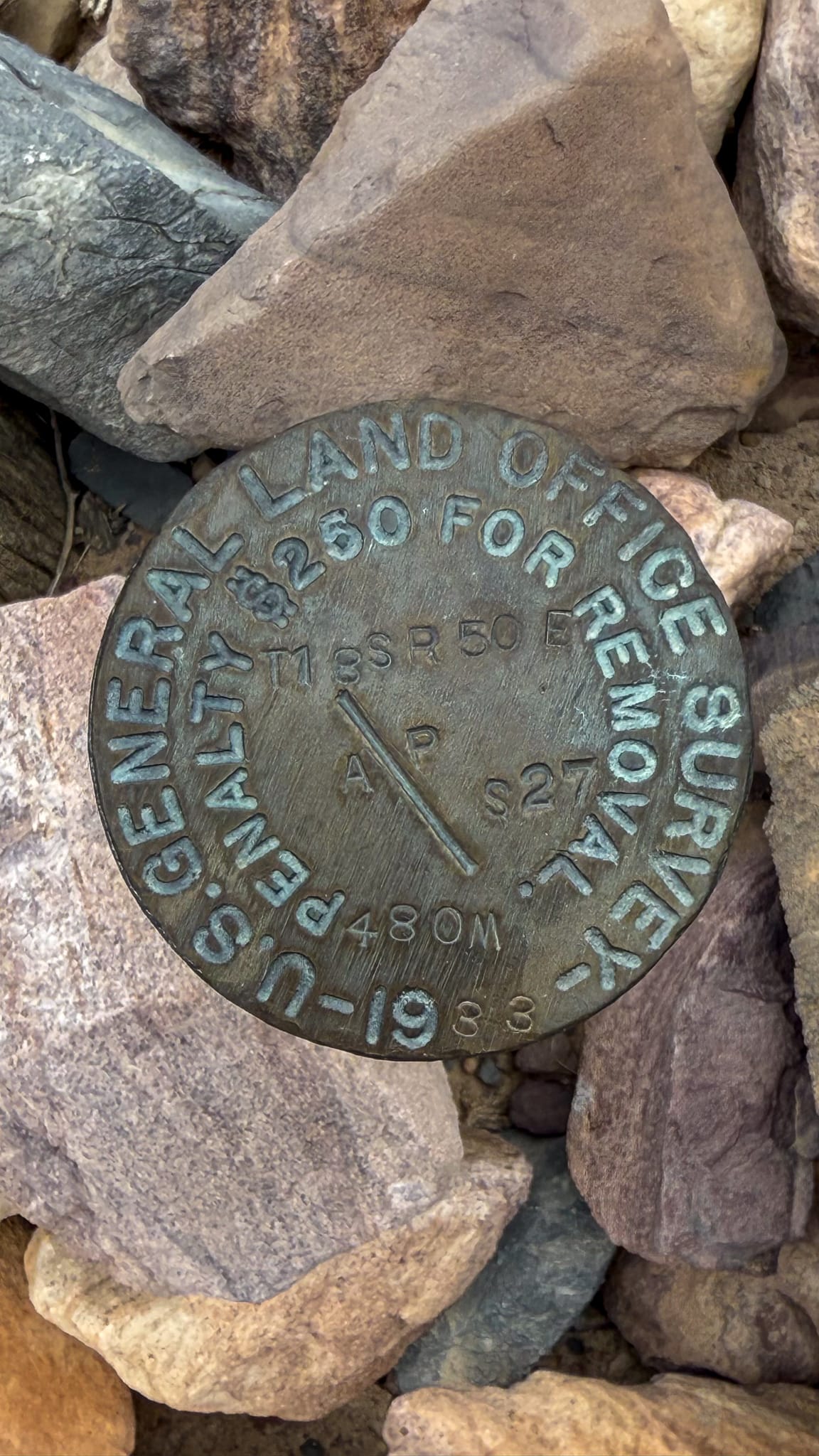 The original 1873 Von Schmidt milepost 480 stands next to a newer metal disc marker placed in 1933. Even though the border moved over a mile to the west, huge swaths of land were still surveyed off the Von Schmidt markers necessitating maintaining both the new CA-NV border monuments and the Von Schmidt Line monuments. In this case, Section 27, Township 18S, Range 50E are surveyed from this Von Schmidt marker, not the real CA-NV boundary - the mistake will remain mapped to the real world forever.